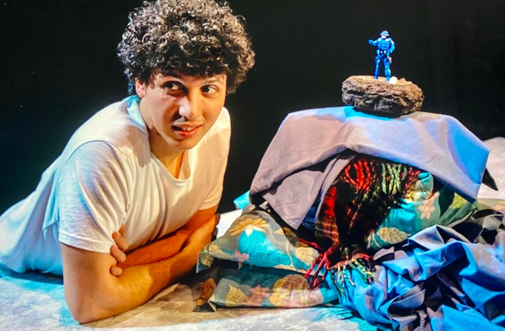 Having translated to play into English, Carlotta Brentan directs a production that is consistently engrossing and equally disturbing. The entire drams unfolds inside a cave which has no natural light, leaving set designer Constance Comparot to fill the tight studio space with a central representation of a rock and Gio’s essential provisions scattered around. Seemingly more challenging is the job of lighting designer and Alex Forey copes admirably.